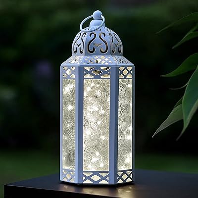 VELA LANTERNS 10.5 Metal Moroccan Decorative LED Fairy Lights Candle Lantern Holder for Indoor Home Fantasy Decor, Table Centerpieces, Outdoor Patio or Porch, Weddings, White, Medium
